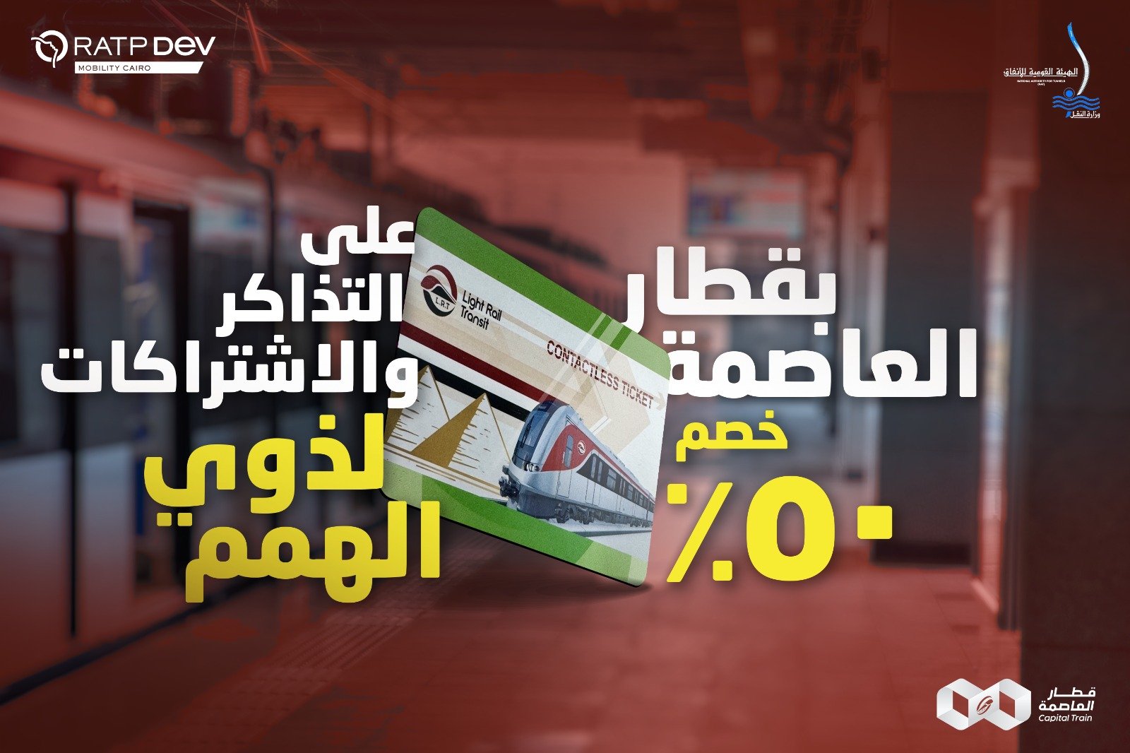 بدءا من السبت القادم 1 مارس وبتوجيهات من وزارة النقل وتحت إشراف الهيئة القومية للأنفاق، أعلنت شركة آر إيه تي بي ديف للنقل كايرو، الشركة المسئولة عن تشغيل وإدارة الخط الأخضر الثالث للمترو وقطار العاصمة عن خصم ٥٠٪ على أسعار التذاكر والاشتراكات لذوي الهمم بقطار العاصمة.