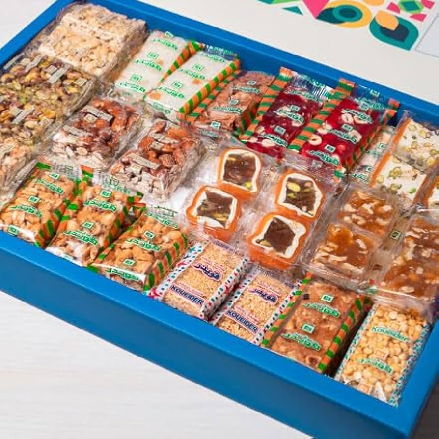 يحتوي على: تشكيلة كاملة من علب رويال (نوجا فستق قمر الدين – عين جمل – سمسمية – فولية – حمامية – بندقية – مستكية – لوزية – كاجو – لديدة – حمام – هريسة زبيب جوز هند – كرسبي – دومية بندق – ملبن بندق – ملبن فستق – قرص حمصية مبني – قشطة بندق).