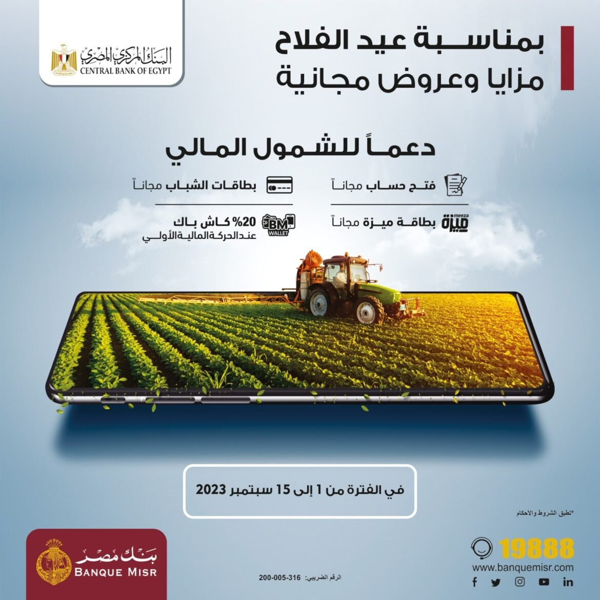 يأتي ذلك انطلاقاً من حرص بنك مصر على دعم جهود الدولة في تحقيق الشمول المالي، واتساقاً مع رؤية مصر 2030 لتحقيق التنمية المستدامة، يقوم البنك بتقديم العديد من المزايا والعروض المجانية لعملائه وبخاصة المرأة والشباب، كونهم الفئة الأكبر في المجتمع، بمناسبة “عيد الفلاح” تحت رعاية البنك المركزي المصري خلال الفترة من 1 سبتمبر وحتى 15 سبتمبر 2023، ويأتي ذلك إيماناً منه بأهمية تحقيق الشمول المالي الذي يهدف إلى تمكين كافة شرائح المجتمع من الوصول إلى المنتجات والخدمات المالية التي تلبي احتياجاتهم المختلفة، ومنها على سبيل المثال؛ حسابات التوفير، والحسابات الجارية، وخدمات الدفع والتحويل، والتأمين، والتمويل والائتمان.